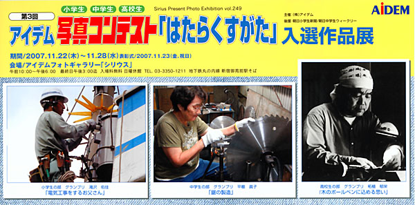 アイデム写真コンテスト「はたらくすがた」入選作品展 2007年11月22日〜11月28日 アイデムフォトギャラリー「シリウス」 http://www.photo-sirius.net